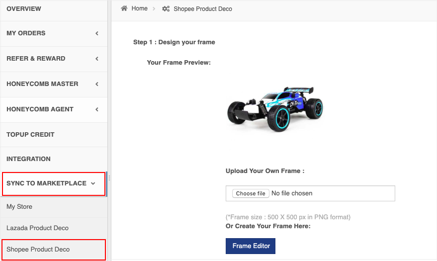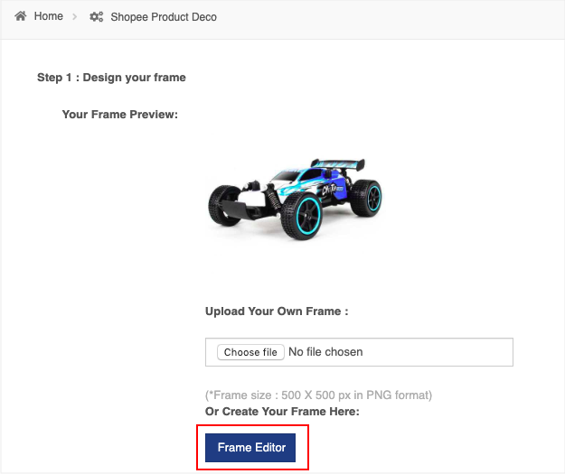 Step 1 (b). You can upload your own frame. The frame size is 500 X 500 px in PNG format).