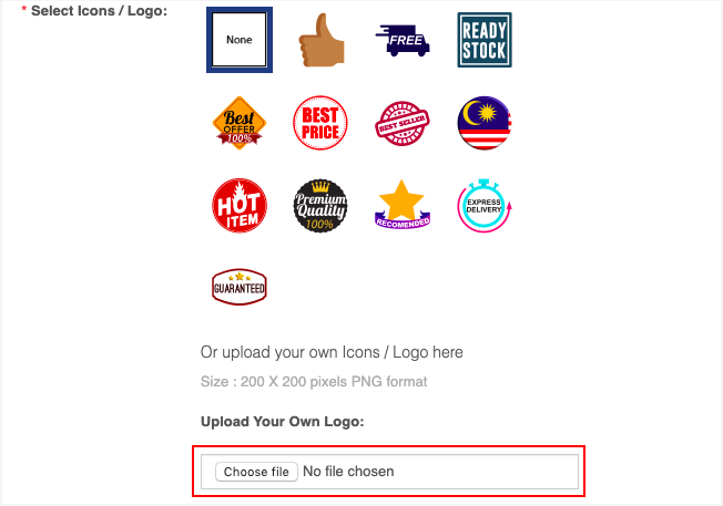 Step 1 (d). Select icons that you refer or upload your own icon. The size must be 200 X 200 px in PNG format.