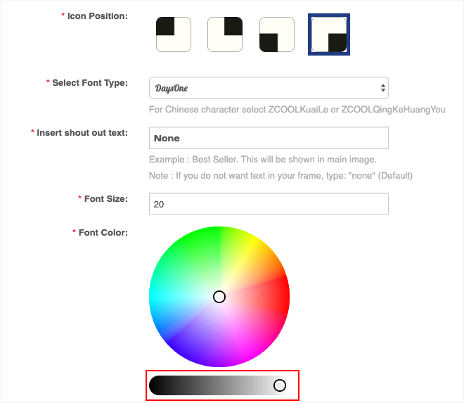 Step 1 (e). Select the Icon Position, Font Type, Shout Out Text, Font Size and Font Colour.