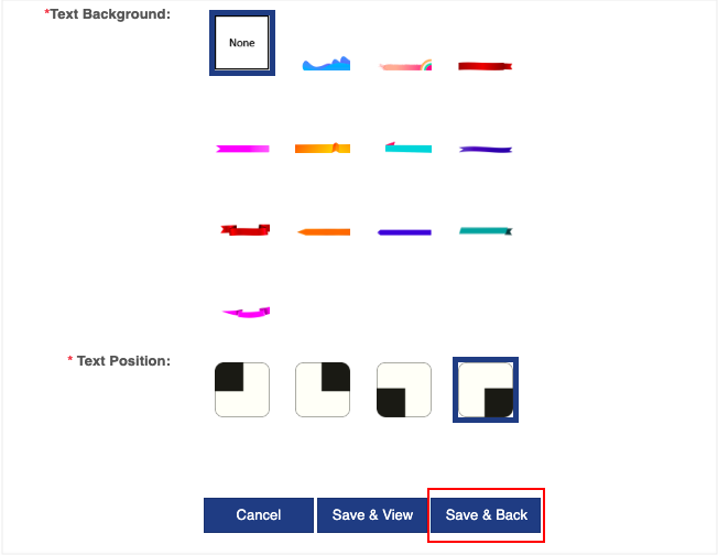 Step 1 (f). Select Text Background and Text Position. After that, click 'Save & Back'.