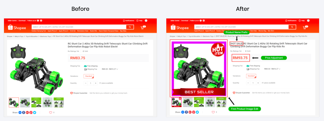 Now you can customize your Shopee product display and be different! Beautify your product main image with promotional labels and add shout outs in front of your product title to gain more attraction from your potential customers.